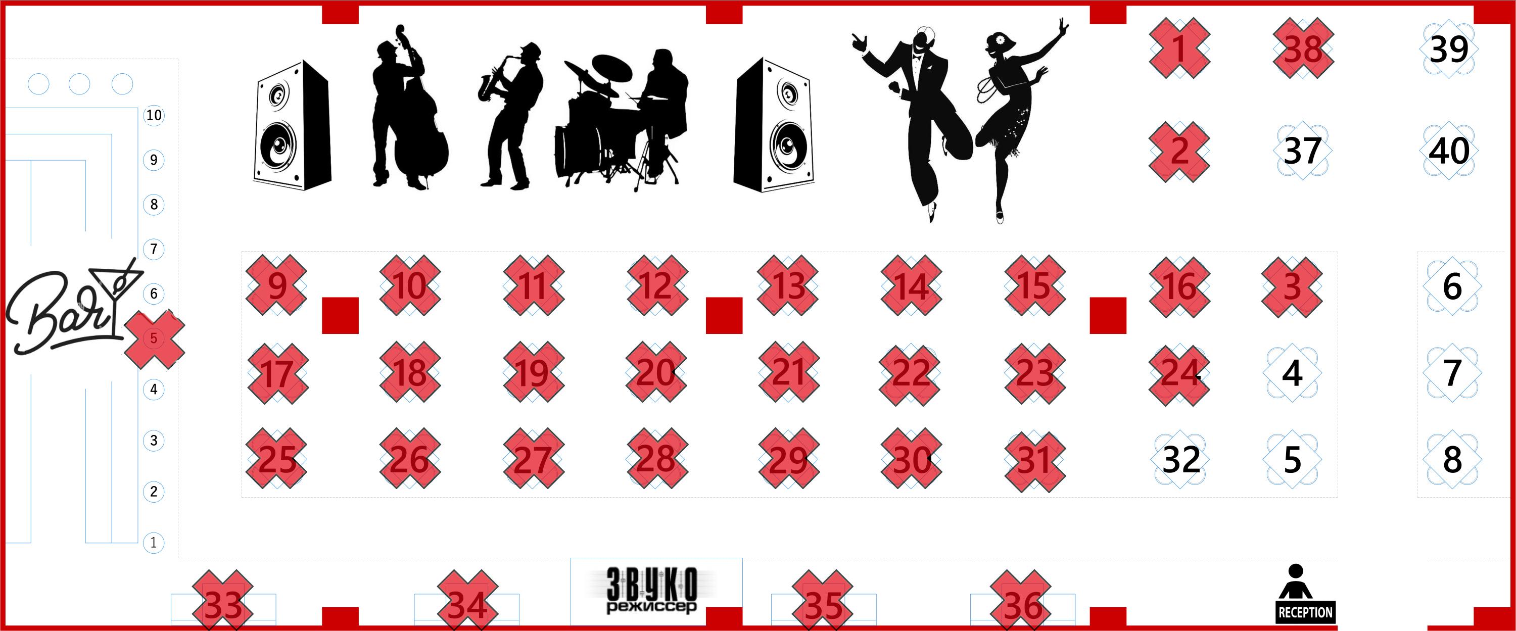 Схема зала на новогоднюю ночь (красный крестик – стол продан; желтый крестик – стол забронирован; без крестика – стол свободен):